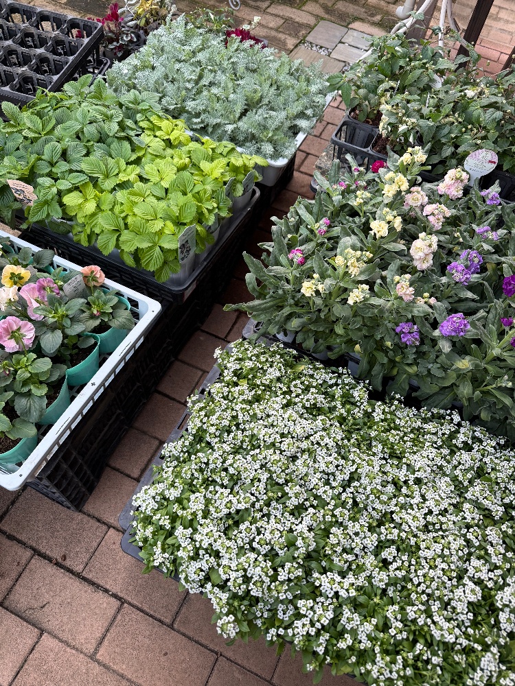 10月28日少し販売苗11月レッスン時にも使います八重咲パンジーふわどれすアリッサムダスティンミラーシルバーレースワイルドストロベリーゴールデンアレキサンドリアワイルドストロベリーゴールトロピカルアロマストックベイビー