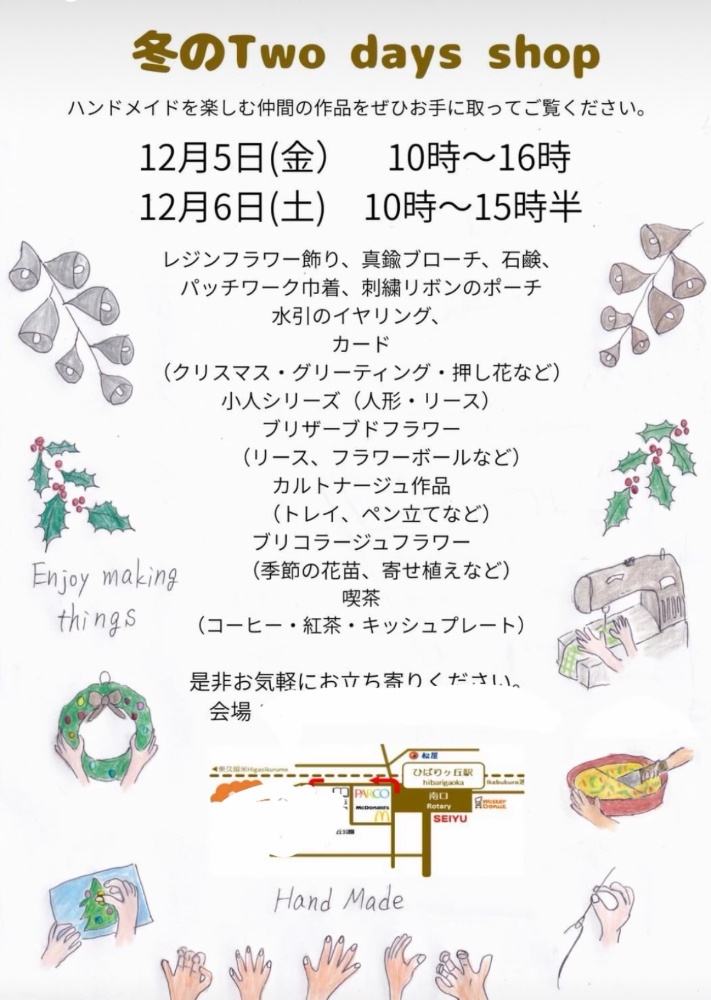 個人宅の為、住所等の記載はしていませんが毎年沢山の方々がいらっしゃいますアットホームなハンドメイド作品などfairydoorでは、小さなブリコラージュフラワー作品や花苗・雑貨など販売致します田無のイベントへ来られなかった方も西武池袋線ひばりヶ丘駅から直ぐの場所是非お立ち寄りください初めての方には住所案内をしています遠慮なくご連絡ください😊