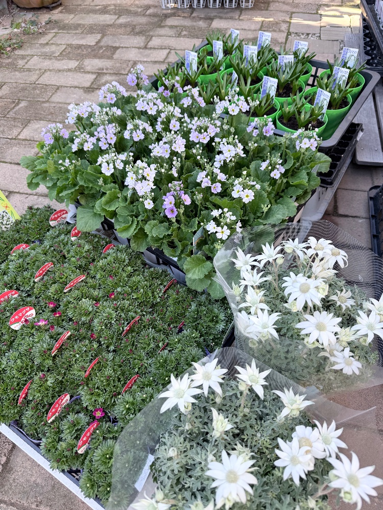 市場より入荷しました•プリムラマラコイデスブルー•ムスカリホワイトスピアー•フランネルフラワー2点•雲間草(お花がまだ咲いていないので2月以降使用します)