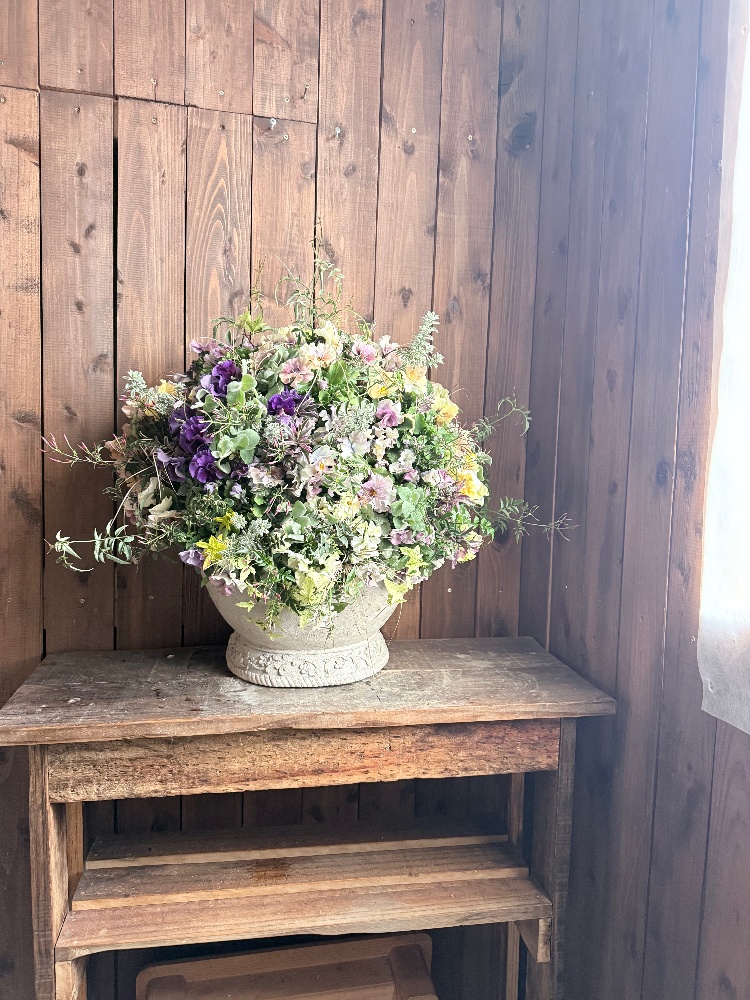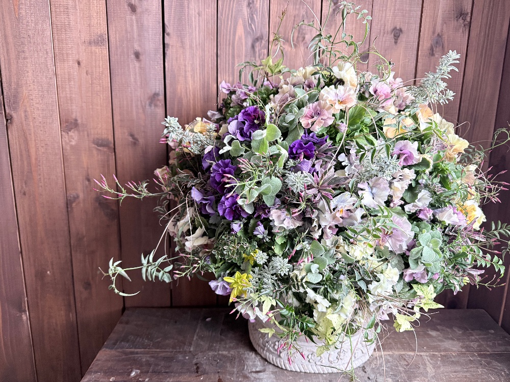 ハンギンバスケットのダイナミックな寄せ植えといったらわかるかな